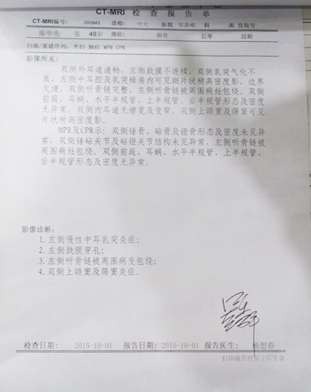 “我以前有在太原看过,那儿医生头上带个镜子给我看,经过检查是中耳问题,药也弄了不少,后来在其他地方又看过好几次,但始终没有看好。”