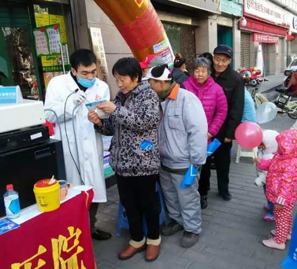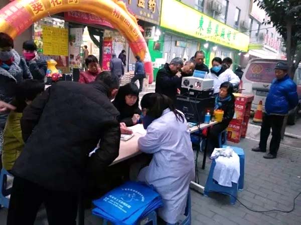 千好百草药店门口设立的临时义诊台前,围满了前来咨询检查的市民。医护人员耐心细致地为市民测血压、测血糖、查体温,做耳鼻喉内窥镜检查,并为市民提出治疗和保健建议,嘱咐大家要合理膳食,适量运动,保持好的心情。