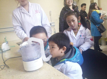 小朋友互相尝试做雾化