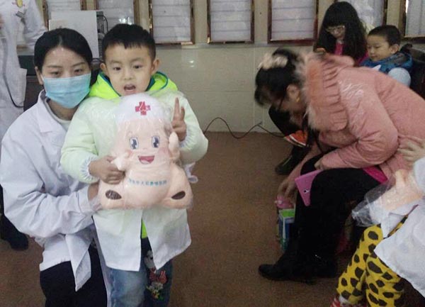 讲课结束后,所有儿童每5人分成一组,由医护人员带领,分别进入各科室进行“小医生”职业体验。