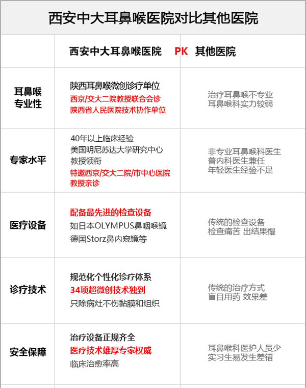 有的鼻炎患者为了图方便,选择去一些附近小诊所或普通医院治疗,小诊所和普通医院技术和专家水平跟不上,导致鼻炎治不好。一些综合医院重点是心脑血管疾病,耳鼻喉科不重视,不会引进先进的技术及好的专家,西安新城中大耳鼻喉医院对比其它医院有哪些优势?一张图告诉你。