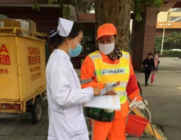 ▲西一路环卫孙大姐正在认真了解西安新城中大耳鼻喉医院的健康扶贫政策
